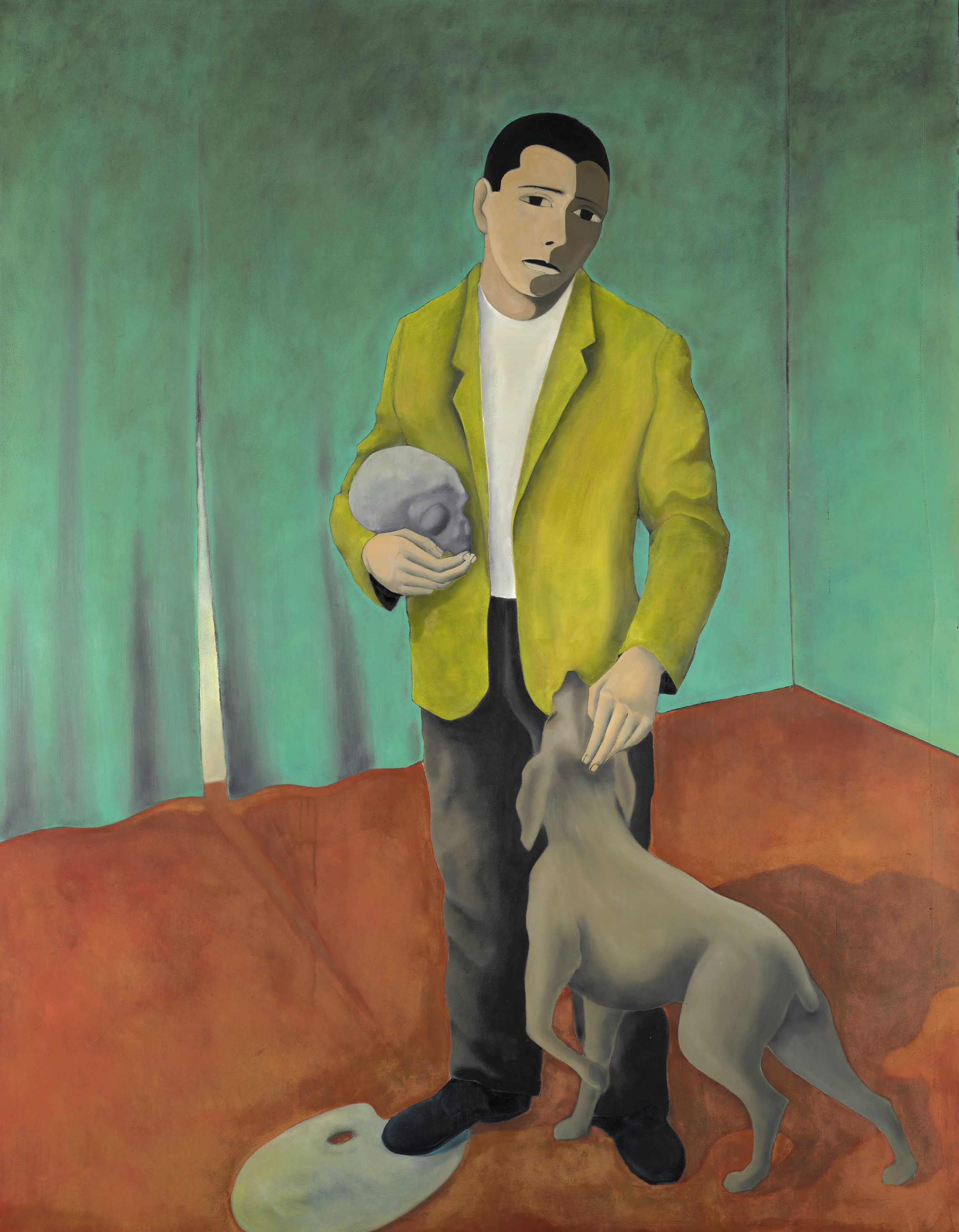 Bien que dépouillé, ce grand autoportrait en pied est truffé de symboles. L’artiste caresse un chien, emblème de la fidélité, sans lui retourner son regard qu’il adresse au spectateur. Il ne se montre pas ici en train de peindre comme dans le sous-genre fréquent de l’autoportrait de l’artiste au travail. Il évoque son métier par la seule présence de la palette immaculée coincée sous son pied ; cette silhouette ovoïdale fonctionne presque comme une anamorphose de la tête de mort. Enfin, l’arrière-plan est un mur recouvert d’un rideau, signe de la théâtralité de cette représentation et plus généralement de la vie.