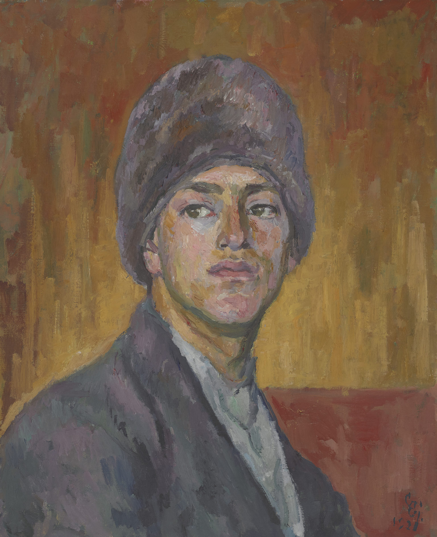 Longtemps partagé entre peinture et sculpture, Alberto est ici dans le rôle du modèle, rôle qu’à l’instar de sa sœur et de ses frères il tient depuis l’enfance et qui a largement participé à son éducation artistique. Il porte une toque de fourrure qui dissimule son épaisse chevelure bouclée. C’est son regard qui frappe surtout, un regard tourné vers l’extérieur, méditatif, qui semble interroger le futur. Les sourcils épais, les lèvres charnues, le menton volontaire et le regard songeur définissent son visage. Le peintre déploie ici l’audace chromatique qui caractérise tout son œuvre. Les contours sont affirmés. Posées avec assurance et fluidité, les touches rapides sculptent le corps, cette masse violette et grise qui se détache sur un fond chaud. Le vert, le jaune et le rouge alternent, contrastent ou se fondent pour déterminer une dominante orangée.