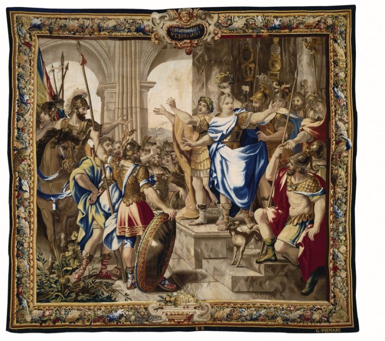Cette tapisserie flamande appartient à une tenture en huit sujets racontant l’histoire des généraux romains Vespasien et Titus pendant la Première Guerre judéo-romaine (66-73 ap. J.-C.) au cours de laquelle les troupes romaines parviennent à mater l’insurrection juive, notamment grâce à la prise de Jérusalem en l’an 70. Les huit sujets de la tenture, d’après les modèles imaginés par le peintre français Charles Poerson et tissés dans les ateliers bruxellois de Gerard Peemans, illustrent le parcours des deux généraux tel que relaté dans les sources anciennes comme la Guerre des Juifs de Flavius Josèphe. La tenture évoque les événements les plus marquants de ce conflit tels que Joseph mené prisonnier devant Vespasien et Titus, L’Assaut d’une ville (prise de Jérusalem) et Le Triomphe de Titus et Vespasien (entrée triomphale à Rome). Elle propose également des sujets plus génériques facilitant, si souhaité par les clients, de soustraire certains épisodes sans que cela nuise à l’ensemble du récit. Ainsi, Vespasien et Titus acclamés représente Vespasien (en tunique bleue) et son fils Titus (à sa droite) en train d’adresser un discours solennel, dit adlocutio, à leurs troupes, une scène souvent représentée dans l’art romain de manière conventionnelle. Les soldats les écoutent avec attention tandis qu’un officier couronne Vespasien de lauriers, en signe de triomphe militaire. L’usage de la composition classique de l’adlocutio permettait aux commanditaires d’en saisir immédiatement le sens général, celui de deux généraux victorieux, offrant un exemple à suivre et par répercussion tirant un parallèle subtil avec le commanditaire lui-même. En effet, extrêmement coûteuse, la tapisserie s’adressait aux classes les plus aisées parmi lesquelles de nombreuses personnalités issues de carrière militaire.